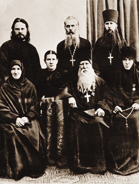 Семья Страгородских. В первом ряду (слева направо): бабушка Пелагея Васильевна, сестра Александра Архангельская, дед протоиерей Иоанн, тетка игуменья Евгения; во втором ряду: диакон Евгений Архангельский, отец протоиерей Николай, архимандрит Сергий