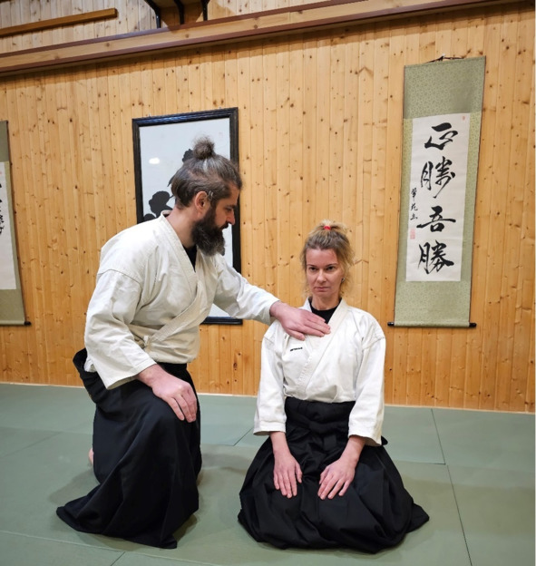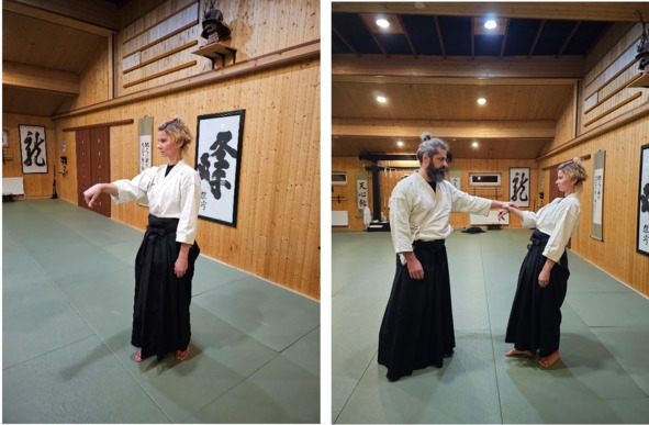 Партнёр А стоит спокойно, протягивая руку вперёд. Партнёр Б пытается толкнуть А за запястье, при этом рука А либо поднимается, либо тело А теряет равновесие и покачивается назад (фото 10).