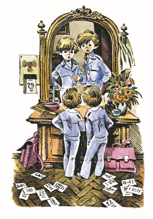 Саша и Алёша надевали новую школьную форму, смотрели в зеркало, а на них из зеркала смотрели совсем другие мальчики. У них был такой важный и строгий вид, что показывать, как раньше, язык им было просто невозможно. Ведь мальчики в зеркале начнут делать то же самое, а это будет совсем плохо, потому что к новой школьной форме никак не подходит высунутый язык. Так уж устроено зеркало – и ничего тут не поделаешь! Наверное, если бы зеркала были на улицах, в автобусах, троллейбусах, метро и школах, то некоторые мальчики и девочки стали бы вести себя лучше. Начнёшь, например, толкаться или щипаться – и сразу в десяти зеркалах десять мальчиков тоже начнут толкаться и щипаться, и, конечно, это будет очень некрасиво.