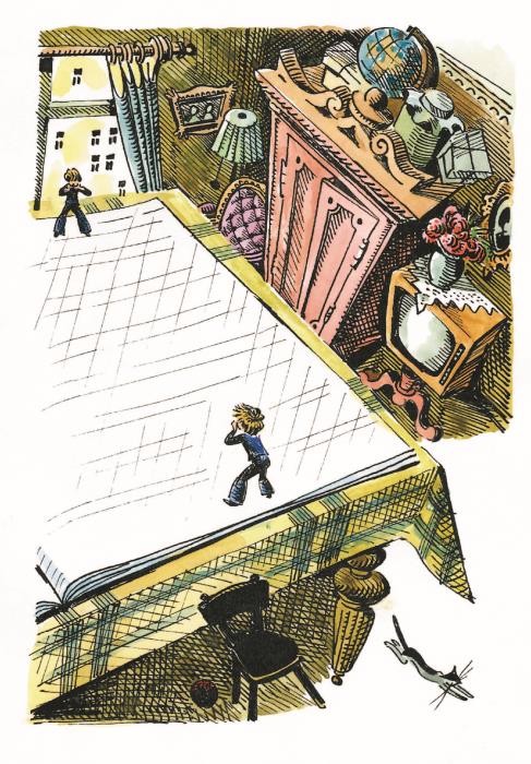 И тут Саша и Алёша увидели, что стол, за которым они сидели, стал расти и скоро сделался таким большим, что они потеряли друг друга из виду. Тогда Саша и Алёша быстро залезли на стол.
