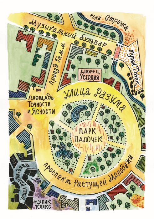 Пожалуйста, не думайте, что Буквоград – маленький город. Конечно, он не такой огромный, как Харьков или Челябинск, но он и не маленький. Он просто средний город. В нём есть и улицы, и переулки, и тупики. Если смотреть на Буквоград с вертолёта, то видно, что похож он на большую букву Б. По кружку этой буквы идут две главные улицы: улица Разума и проспект Растущей Молодёжи. Они сходятся на площади Точности и Ясности. В одну сторону от площади идёт проезд Гамм, который ведёт к Музыкальному бульвару. В самом центре города расположен живописный парк Палочек. В парке движение транспорта запрещено, и Палочки могут гулять в полной безопасности.