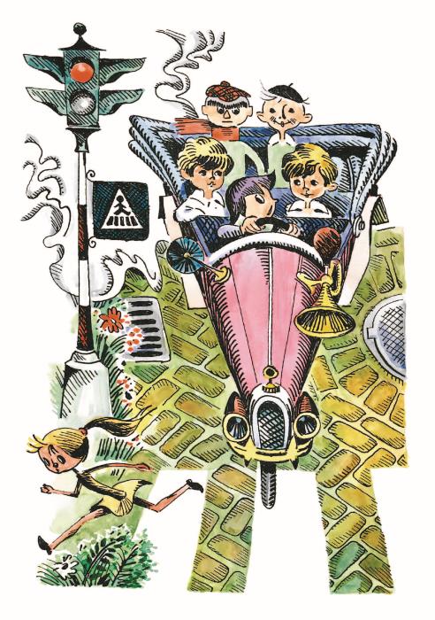 Наверное, нет на свете ребят, которые не любили бы кататься на машине, особенно если она мчится с большой скоростью. Сливе, видно, тоже нравилась быстрая езда. Она уверенно сидела за рулём, нажимала ногами на педали и оглушительно сигналила, если какая-нибудь Палочка перебегала улицу в неположенном месте.