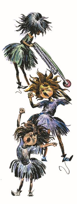 Сначала Ах и Ох топтались на одном месте, потом они всё выше и выше начали вскидывать ноги, а под конец Ах решил перевернуть Оха через голову. Но Ох неудачно перевернулся и со всего размаха упал прямо на раскладушку! От неожиданности и испуга Кляксы завопили и вскочили на ноги, сбросив Оха на землю. Теперь уже завопил Ох, а испуганные Кляксы с удивительной проворностью сложили раскладушку и, толкая коляску с принцессой, умчались прочь.