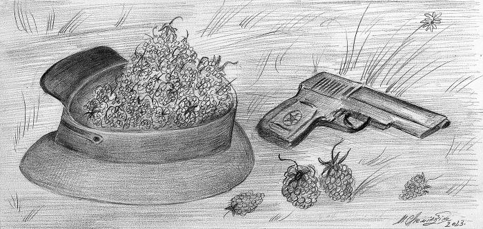 Собаки ведут в малинник, солдаты раздвигают кусты и… замирают по стойке смирно. Перед ними, подстелив китель под зад, сидит в белой рубахе, в галифе и сапогах живой и невредимый полковник Шемякин. На коленях у него лежит офицерская фуражка, полная малины. У ног лежит пистолет. Глядя на мою изумлённую заплаканную мать, отец, опустив спелую ягоду в рот, задумчиво произносит: “А знаешь, Юля, малина здесь очень хорошая”.