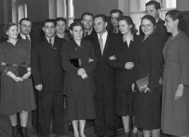 Назим Гаджиев с Бёюкага Векиловым, Владимиром Рассяевым и другими сотрудниками отдела науки и школ ЦК КП Азербайджана, 1956 год