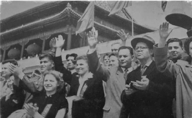 Алекссандр Шелепин и Назим Гаджиев во главе делегации советской молодёжи на площади Тяньаньмэнь в Пекине, 1954 год