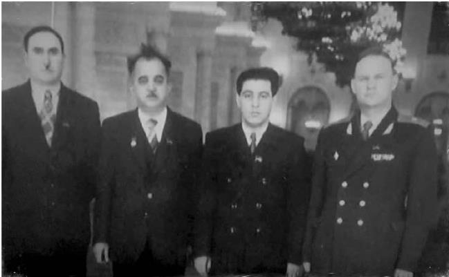 Назим Гаджиев с Юсифом Мамедалиевым, Кямраном Гусейновым в кулуарах Колонного зала Кремля на XX съезде КПСС, 1956 год