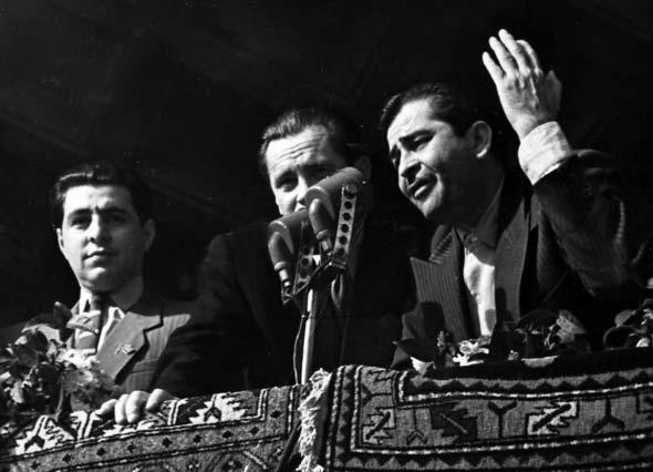 Назим Гаджиев с Радж Капуром во время митинга азербайджано-индийской дружбы на Республиканском стадионе, октябрь 1956 года