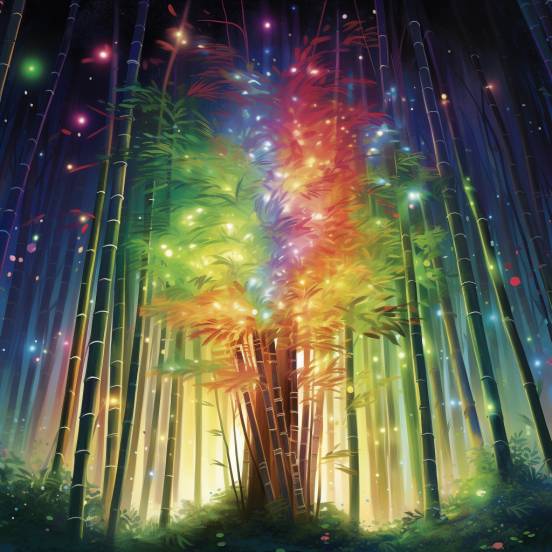 Мудрый Шепчущий Бамбук был необычайно высоким, превосходя все другие бамбуковые растения. Его листья сверкали оттенками синего и зеленого, будто звезды, мерцающие на ночном небе.