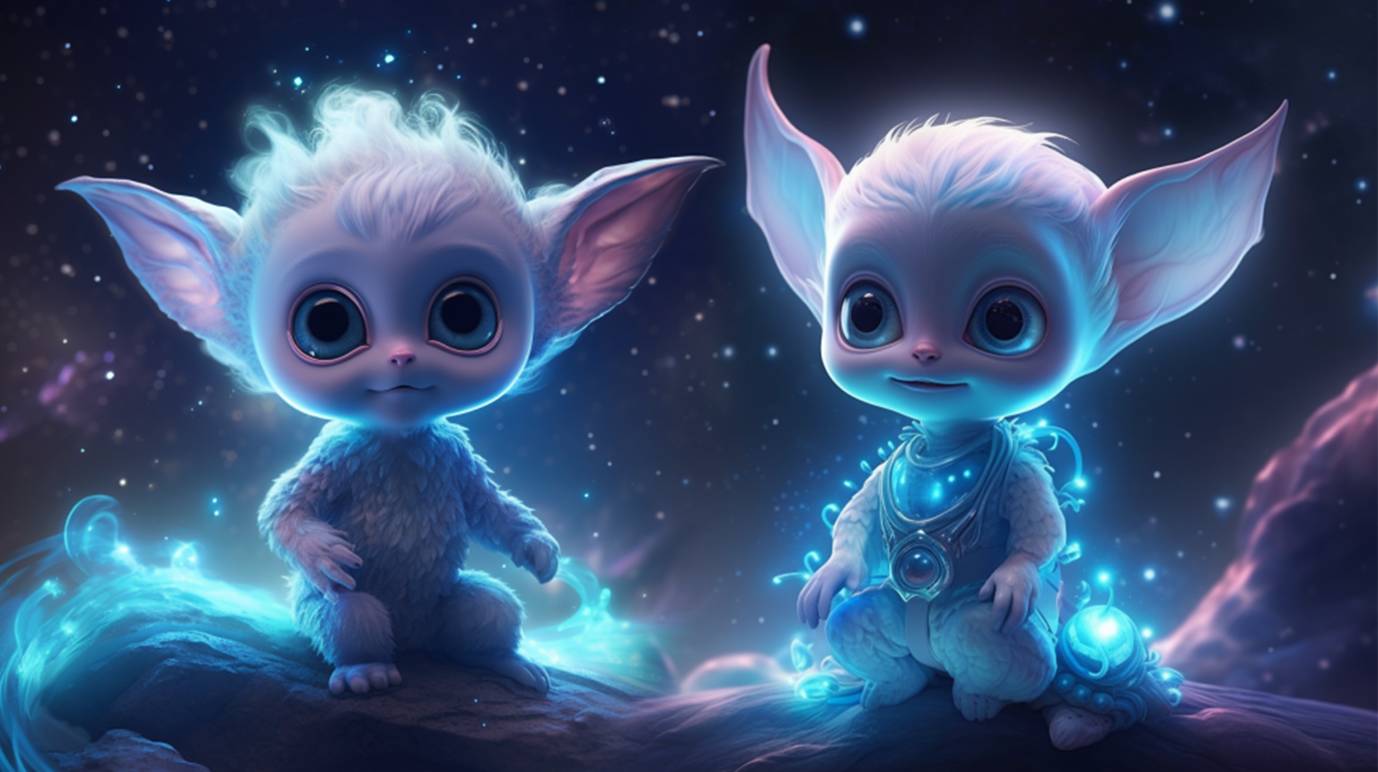Мы любовались светом звезд на небе, когда заметили, что две из них стали двигаться быстрее других и расти у нас на глазах, пока не превратились в маленькие существа, все тело которых как будто было покрыто мерцающими искрами. Они излучали звездное сияние, бросая мягкий свет на окружающие их предметы. Казалось, что все их тело состоит из лунного света, а сами они невесомые и почти прозрачные. Они, спустившись со звездного неба, приблизились к нам, и оказались очень безобидными и слегка испуганными малышами.