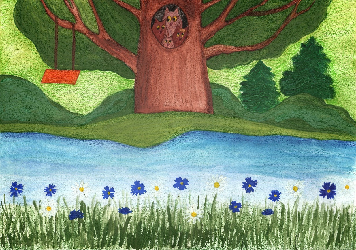 В одном волшебном лесу, на берегу Василькового озера стоял старый дуб. В тени его раскидистых ветвей, в уютном дупле жил Совенок Яша со своей семьей. Он был веселый, добрый, озорной. И было у него много друзей.