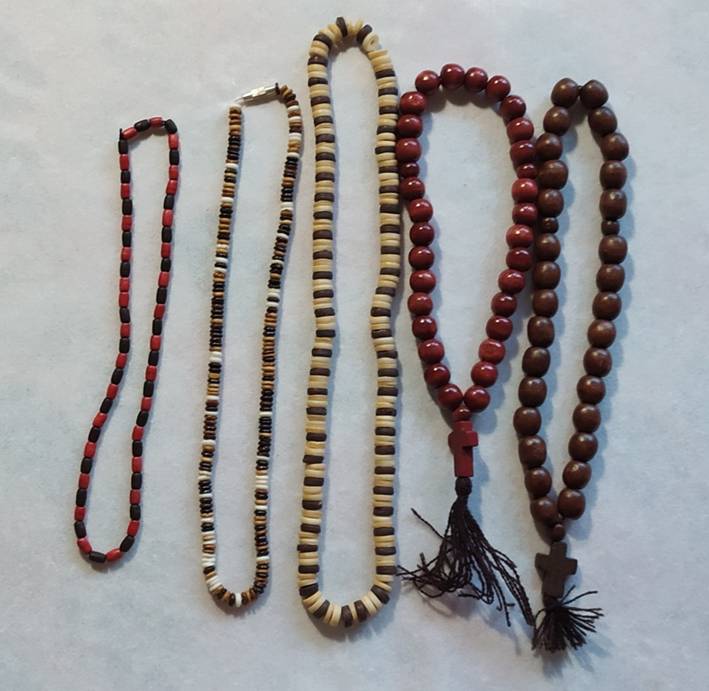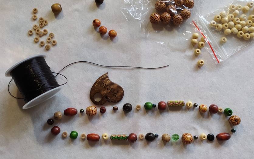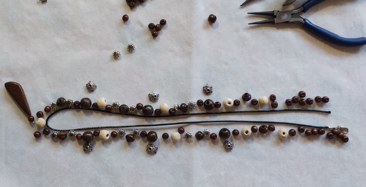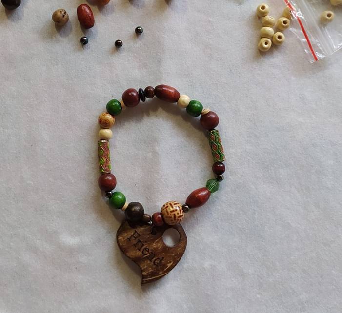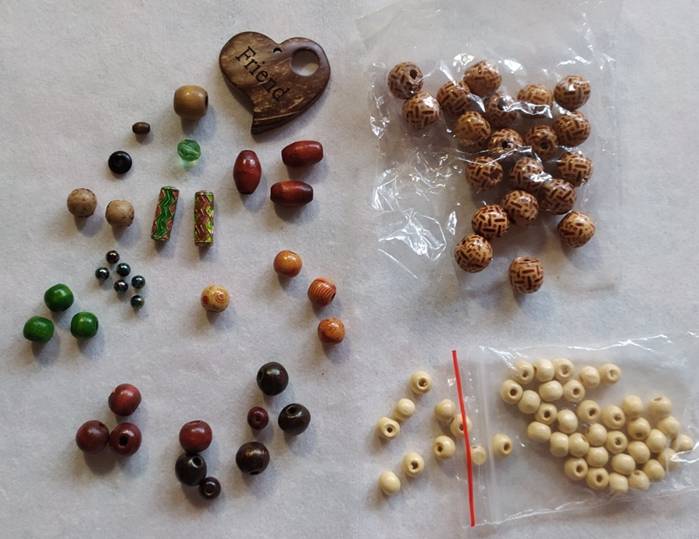 В основном деревянные бусины разных размеров и цветов, с рисунком и без, одна стеклянная, две металлические трубочки с эмалью, один чёрный плоский «блин» из пластика, две бусины из натурального камня и шесть металлических. А так же сердечко из скорлупы кокосового ореха.