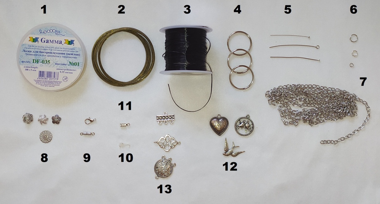 1. леска для ювелирных украшений, бисероплетения. Подойдет и рыболовная, не очень тонка,