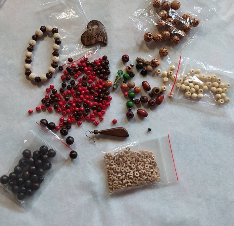 Что у меня тут? Деревянная сережка – дужку с неё уберу, она мне не пригодится. Немного деревянных бусин под слоновую кость с рисунком и столько же необычной формы, остальные – деревянные, простые, судя по виду и цвету с чёток.