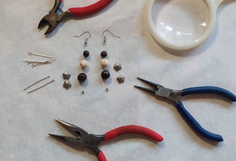 Для этого мне понадобились дужки, пины с плоским наконечником, шапочки для бусин, металлические шарики. Из инструментов пассатижи и круглогубцы.