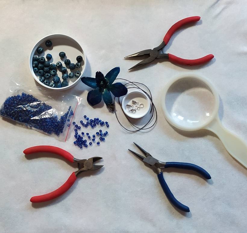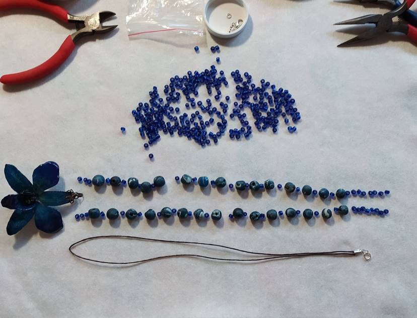 Итак: для изготовления колье с цветком понадобятся пассатижи, круглогубцы, бокорезы, тонкий шнурок, два крепежа, три соединительных кольца, одна застёжка, одна цепочка-удлинитель длинной в 5 см, пакет синего крупного бисера, бусины из полимерной глины и сам цветок в смоле.
