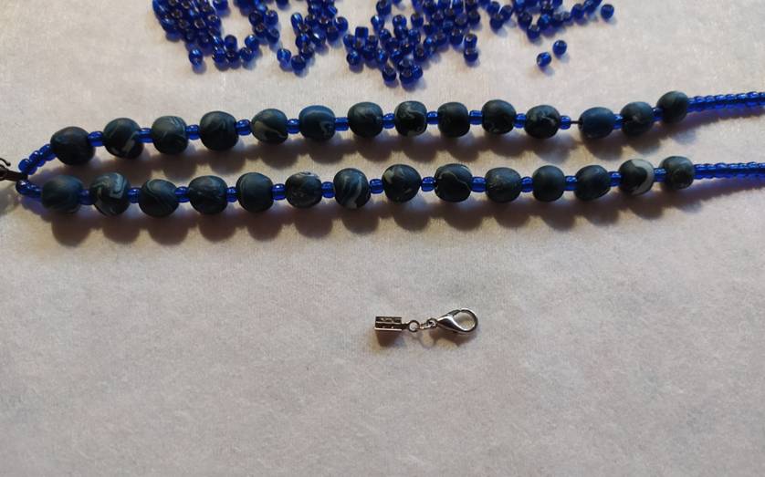 Нанизав на леску оставшиеся бусины, фиксирую второй край лески так же, как и первый. С помощью соединительных колец прикрепляю застежку.