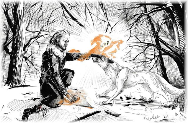Путник произносил слова медленно, но с каждым разом всё громче и громче, словно он пытался достучаться до самой души волчьей. Его голос в этот миг звучал как раскат грома, исходящий от него к зверю, некая сила будто бы выбивала из животного всю злость. Он внимал, постепенно стал забывать о своей ярости, его глаза были сильно напряжены и взволнованы – будто бы волк узрел окружающий мир в новом свете, в свете человеческого понимания вещей. Стало заметно и то, что с того момента, как человек ухватил зверя за лоб и стал с ним говорить, вдоль его руки простёрлись странные, светящиеся жёлтым светом рунические символы. Казалось, это сияние было потоком духовной энергии, направленной к зверю. Путник держал животное левой рукой, но руны указывали на источник энергии, исходящий от правой руки, а точнее, от предмета, которого она касается. То была толстая книга в шёлковом переплёте, который явно недавно был на неё наложен. При её использовании в обращении со зверем предмет стал заметно светиться золотистым цветом, а неизвестная светлая энергия переходила к путнику с ещё нераскрытых страниц книги. Что это была за сила – не ведал и сам человек, он лишь верил, что был хранителем великого знания, с коим предначертано совершать исключительно благие, добрые дела, несущие просвещение и целительный свет в сердца всех живых существ.