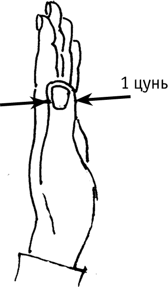 Чтобы отмерить 1 цунь от сгиба запястья, надо приложить большой палец (см. рис. 1). Причем мужчина должен приложить левый палец, а женщина – любой (если, конечно, ее ремесло не предполагает уплощение пальца, как у пряхи, например).