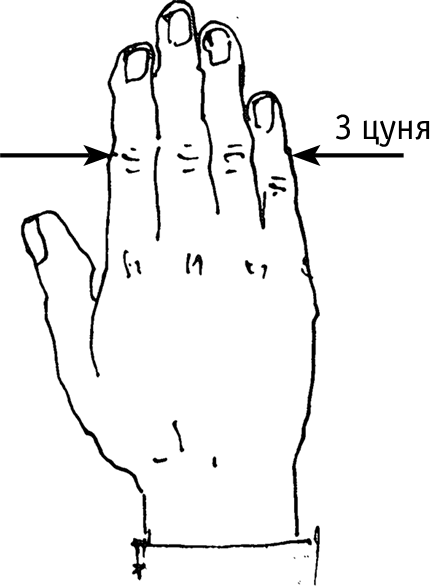 Чтобы отмерить 3 цуня, складываем 4 сомкнутых пальца выпрямленной (правой или левой) ладони (рис. 2).