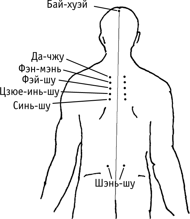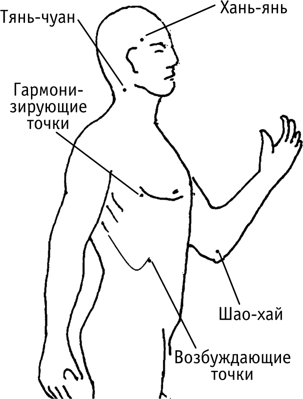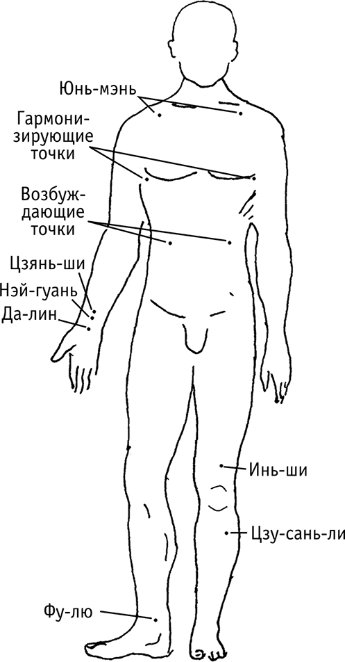 Точки возбуждения (как правило, тоже симметричные относительно вертикальной срединной линии тела). Они заставляют быстро откликнуться те органы, которые относятся к данному меридиану.