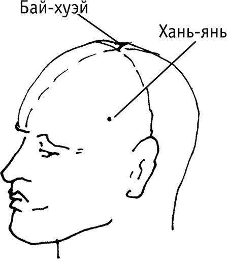 Точки на головеБай-хуэй («соединение пересечений») расположена в центре темени, на пересечении срединной линии головы с линией, соединяющей кончики ушей. Воздействие на точку предотвращает головокружение, шум в ушах, помогает при частой одышке, сердцебиении, климактерических неврозах, артериальной гипертонии (рис. 3, б и рис. 3, г).