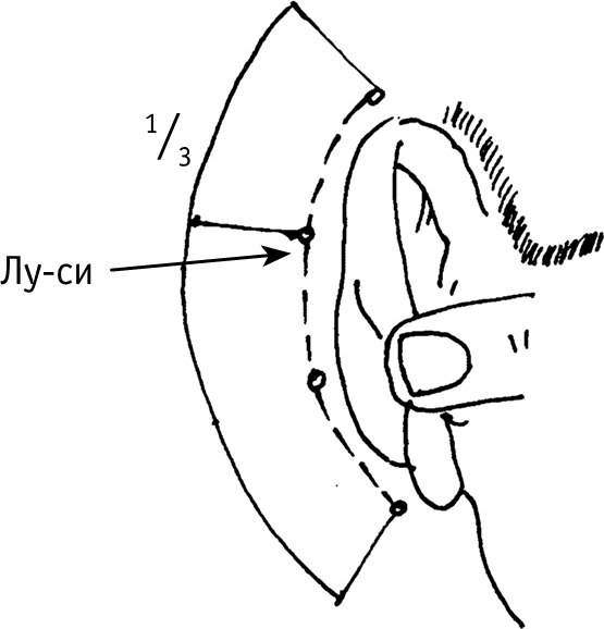 Лу-си («покой черепа») находится на 1/3 длины дуги за ухом, считая от верхней точки дуги (рис. 3, д). На точку воздействуют при головных болях, шуме в ушах, бессоннице, чувстве страха, боли в грудной клетке, рвоте (вызванной повышенным давлением).
