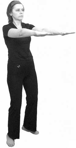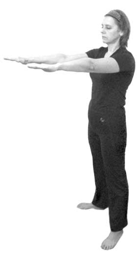 1. Ладони обращаем вниз и руки очень медленно поднимаем перед собой до уровня плеч. При этом делаем глубокий плавный вдох через нос (фото 1).