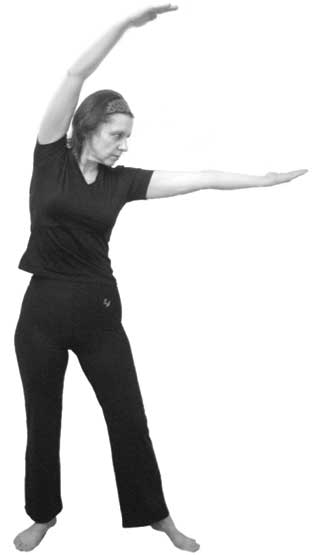 Левая рука при наклоне описывает над головой полукруг. Во время этого движения делается выдох.