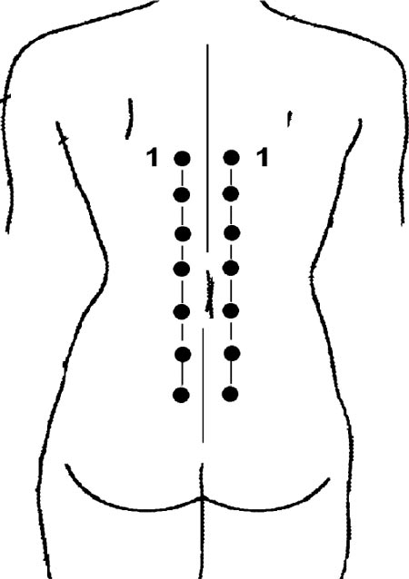 2. Если боль не унялась, надавливаем поочередно с каждой стороны позвоночного столба, начиная от точки (1) – вниз. Прорабатываем точки через каждые 5 см, опускаясь до 5-го поясничного позвонка. Каждое надавливание длится не менее 3 секунд.