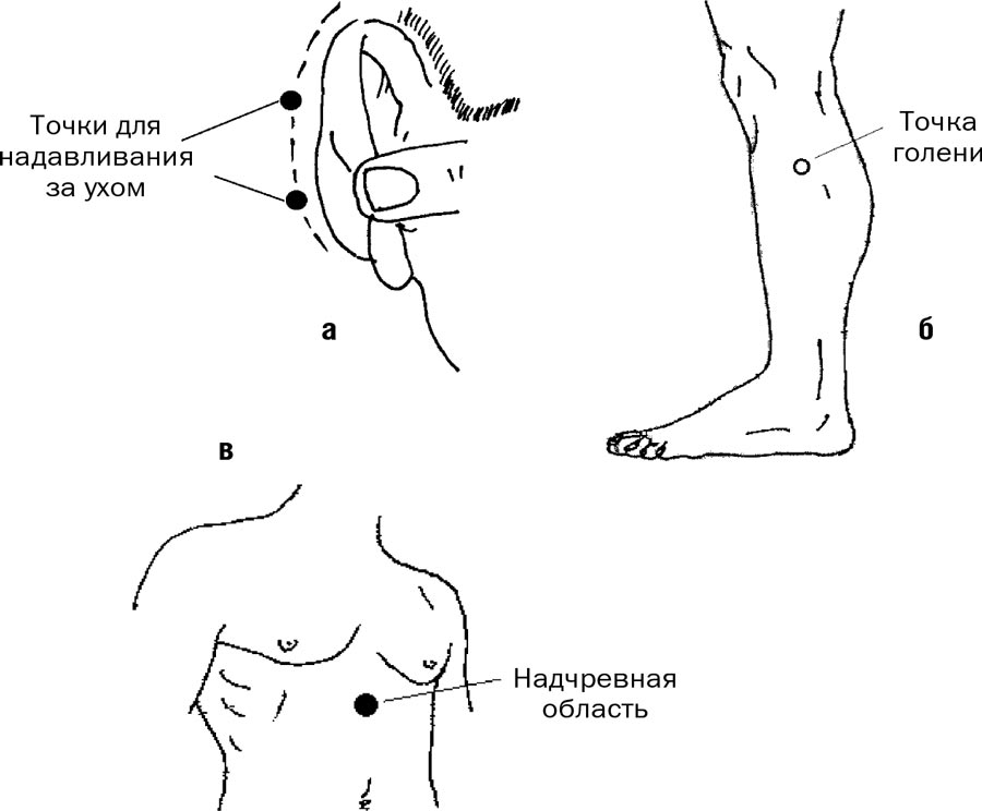 2. Если укачивание возникает при резком торможении, поворотах автомобиля, нужно остановиться, выйти на воздух и сильно надавить на сосцевидные отростки за ухом (выступающие за ухом кости, рис. 3, а) и на надчревную область (рис 3, в).