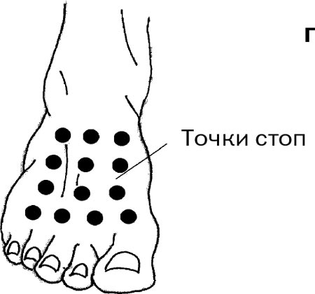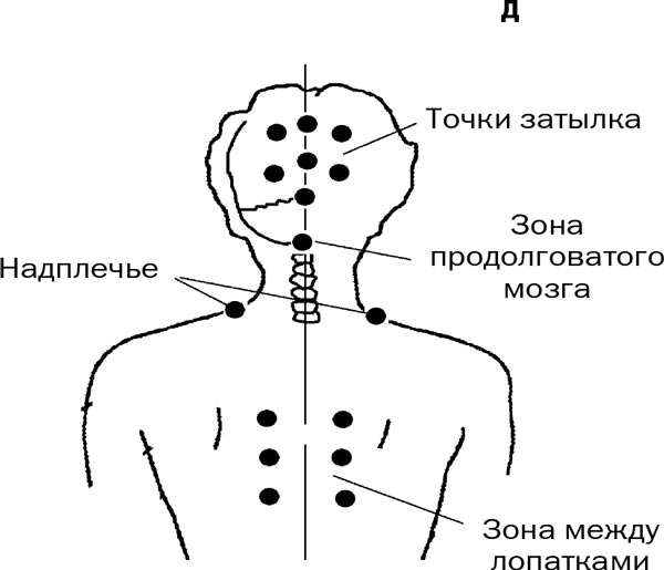 Чтобы помочь себе, надо надавить пальцами на особые точки на голенях (одновременно на обеих, см. рис. 3, б), затем обработать надавливанием своды стоп (в течение 5 секунд каждую точку, рис. 3, г), а также зону продолговатого мозга (рис. 3, д).