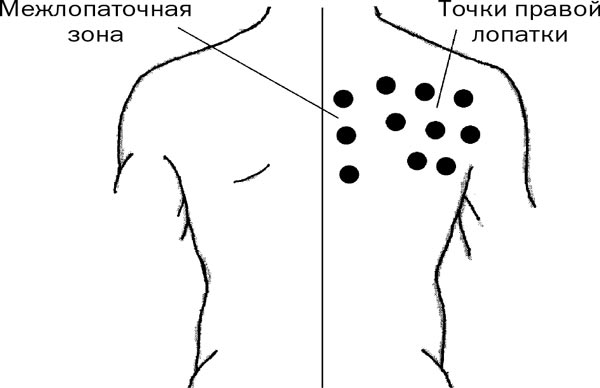 Нарушение обмена веществ приводит к несвоевременному расщеплению холестерина и других веществ, образованию конкрементов и камней в желчном пузыре. Шевеление даже небольших камней дает остро болезненную реакцию, называемую печеночная колика. Распространение боли возможно в правую лопатку, в межлопаточные зоны и даже правое плечо. Если нет возможности обратиться к врачу, поступаем так.