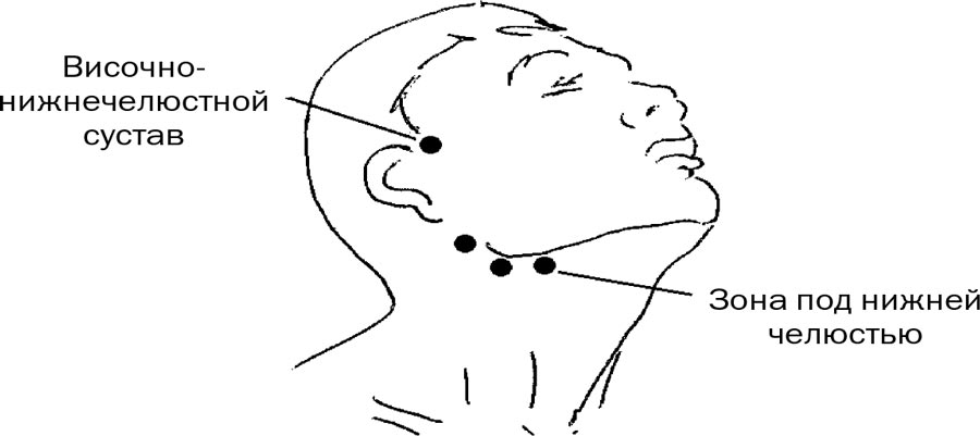 1. Надавливаем трижды по 3 секунды большим пальцем под нижней челюстью со стороны болезненного зуба (рис. 6).