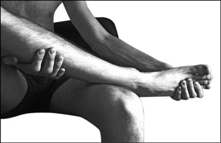 3. При ушибе голеностопа сгибаем больную ногу в колене и аккуратно растягиваем ее руками (фото 4): одна рука поддерживает ногу под коленом, другая плавно тянет голеностоп вперед, чтобы задействовать в работу всю голень («растянуть» голень). Такое лечение ускорит заживление тканей мышц и суставов.