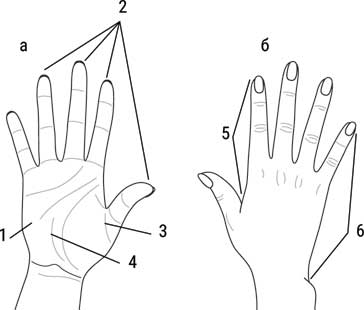 1. Кисть: основание ладони (4), ладонную поверхность, тыльную сторону кисти, локтевой (6) и лучевой (5) края кисти, возвышения I и V пальцев (1).
