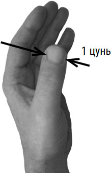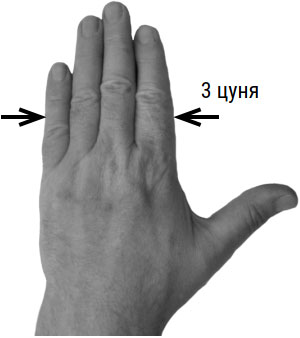 3 цуня – ширина 4 сомкнутых пальцев выпрямленной (правой или левой) ладони (фото 2).