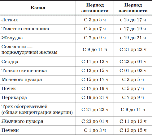 Энергия проходит по каналам последовательно в течение суток, перетекая из одного канала в другой. За 24 часа совершается энергетический кругооборот. Лучше всего воздействовать на определенный канал в период его максимальной активности. Если этот период приходится на время сна, можно использовать для работы время общей концентрации энергии с 21 до 23 часов. Но главное – не проводить терапию в период пассивности канала.