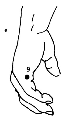 Точка (9) цянь-гу («перед ущельем горного потока») расположена в углублении у основания мизинца на боковой стороне ладони (рис. 2.4, е). Основной эффект от воздействия на цянь-гу – лечение болезней со свойствами жара (лихорадочные состояния без пота, сухость в горле, жажда, затрудненное мочеиспускание красной мочой при заболеваниях печени и почек).