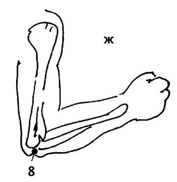 Точку (9) сяо-хай («море тонкого (кишечника)») можно найти при согнутой в локтевом суставе руке, в углублении между локтевым отростком локтевой кости и медиальным надмыщелком плечевой кости (рис. 2.7, з). Дополнительный эффект от воздействия на точку: лечение суставов (при боли по наружной поверхности предплечья, локтевого сустава, плеча и плечевого сустава); лечение нервных расстройств; снижение болей в затылочной области, улучшение слуха.