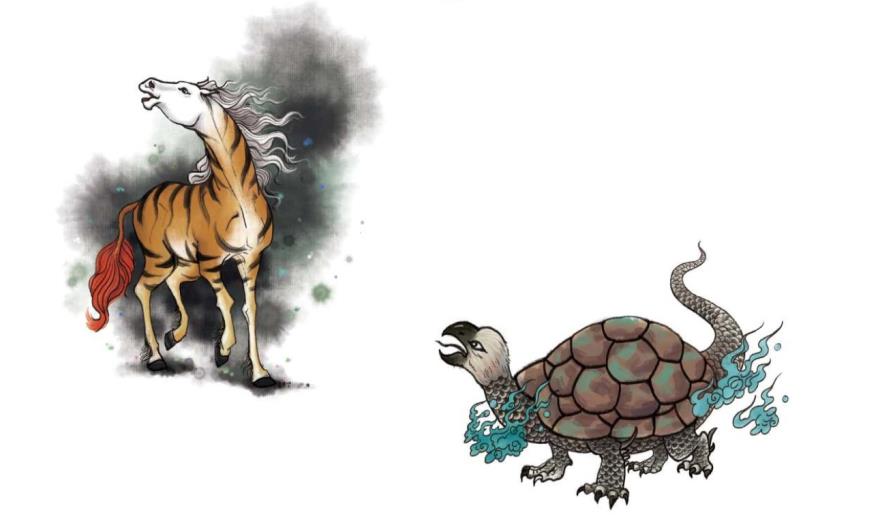 Первая: поскольку описания божеств и зверей в «Книге гор и морей» чаще всего достаточно краткие и имеют несколько вариантов толкования, при создании иллюстрации художнику необходимо было задействовать своё воображение – расширить образ, обогатить его и усовершенствовать.