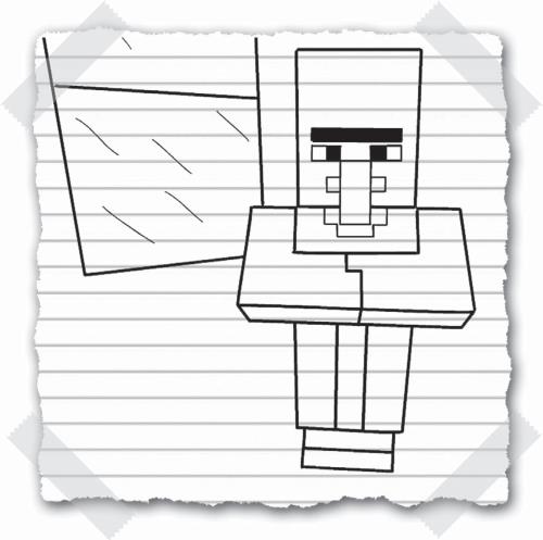 Затем я увидел библиотекаршу. Я подошел к ней и похлопал по плечу. Случилась очень странная штука. В воздухе над ней появился квадрат – словно в комиксе. Я догадался, что она библиотекарь, потому что в квадрате были изображены три книги и стрелка, указывающая на овальный предмет зеленого цвета. Что это было? Авокадо? Яблоко? Потом я решил, что раз игра называется «Майнкрафт»[1], то, наверное, она про шахтеров, значит, это, вероятно, драгоценный камень. Может, изумруд?