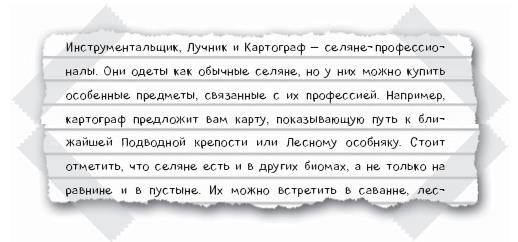 По тропинке я прошёл через лес, преодолел несколько холмов и подошёл прямо к деревне. Она была ОГРОМНАЯ! Если не считать деревни в ледяном мире, это было самое большое поселение, что я видел в «Майнкрафте»! Кучи селян говорили своё «Харр» и ходили туда-сюда. К сожалению, у меня обнаружились проблемы с одной маленькой незначительной деталью… я не знал, какого цвета одежду носят селяне каких профессий!