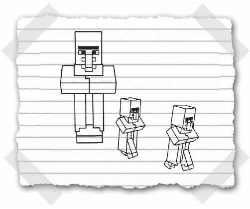 Но и это не всё, что я нашёл в деревне. Бродя по улицам, я увидел нечто, чего никогда раньше не видел, – и нет, это (для разнообразия) был не новый монстр, готовый меня съесть! Это были… ни за что не догадаетесь – дети селян! Да‑да, дети! Выглядели они точно так же, как и взрослые селяне, просто миниатюрнее. Они очень миленькие (если большие носы и насупленные лица в вашем вкусе, конечно). Они бегали друг за другом между домами и шныряли между взрослыми. Похоже, они играли в догонялки!
