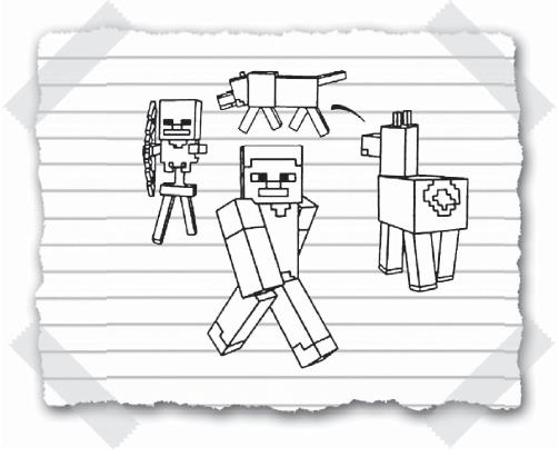 Где-то в районе полудня тропа привела меня к высоким крутым горам. На их вершинах даже лежал снег! Спустя несколько минут я наткнулся на группу странных созданий. К счастью, я увидел их первым, поэтому успел спрятаться за деревом. Может показаться, что прятаться при малейшем признаке опасности – это трусость, но на самом деле это важное умение для выживания в «Майнкрафте»! (А после того, что случилось прошлой ночью, я был не в настроении рисковать!)