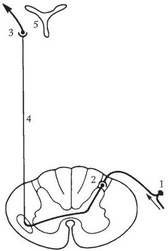 1 – первый нейрон; 2 – второй нейрон; 3 – третий нейрон; 4 – латеральный спиноталамический путь; 5 – таламус