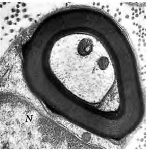 В процессе миелинизации периферического нервного волокна леммоциты формируют отросток цитоплазматической мембраны, который спиралевидно обертывает нервное волокно. Может сформироваться до 100 спиральных слоев миелина правильной пластинчатой структуры, при этом цитоплазма леммоцита вытесняется к ее ядру; таким образом обеспечивается сближение и тесный контакт смежных мембран (цветная вклейка, рис. 1.7).