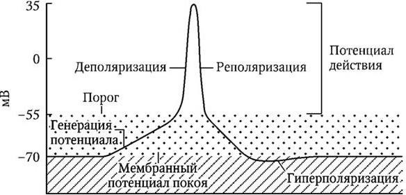 Под влиянием естественной или вызванной внешними факторами стимуляции аксона происходит нарушение селективной проницаемости клеточной мембраны, что способствует проникновению ионов натрия в клетку и редукции потенциала покоя. Если мембранный потенциал снижается (деполяризуется) до критического уровня (30 – 50 мВ), то возникает потенциал действия, и импульс начинает распространяться вдоль клеточной мембраны как волна деполяризации. Важно отметить, что в немиелинизированных волокнах скорость распространения импульса прямо пропорциональна диаметру аксона, и возбуждение длительно прямолинейно захватывает соседствующие мембраны (рис. 1.9, 1.10).