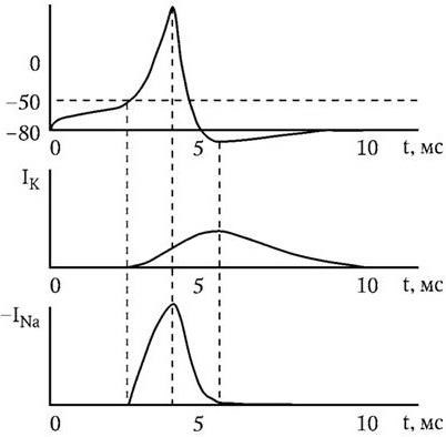 Рис. 1.10. Зависимость ионных токов и мембранного потенциала от времени