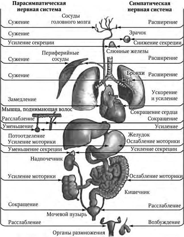 На основании топографии вегетативных ядер и узлов, различий в длине первого и второго нейронов эфферентного пути, а также особенностей функции вегетативная нервная система подразделяется на две части: симпатическую и парасимпатическую (рис. 1.16).